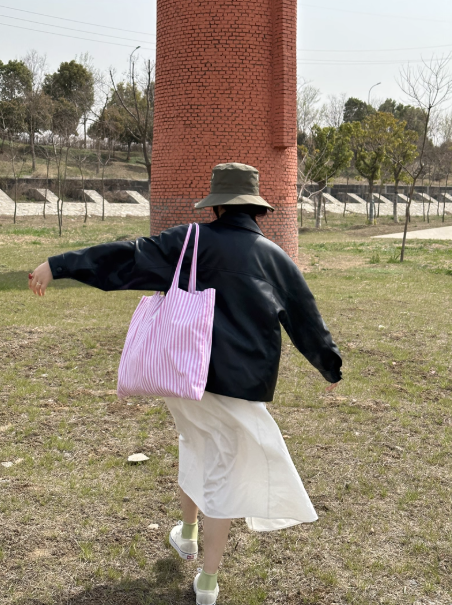 The pink and white stripes form the soul of its design—vibrant yet mellow, instantly evoking the breezy, retro freshness of classic French style. Crafted from premium cotton, the fabric boasts a breathable, soft texture that’s also remarkably durable, standing up to the rigors of daily use with ease. What truly sets it apart is the handmade touch; each stitch and pattern placement carries a unique flair, ensuring no two bags are identical and gifting you a piece that feels distinctly your own, ready to turn heads.
