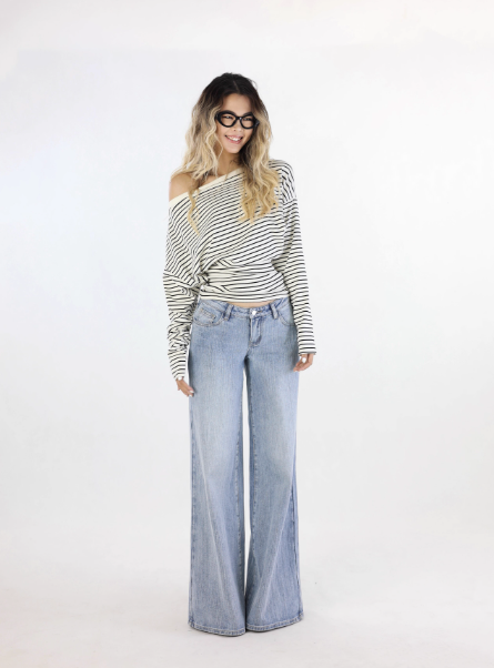Let’s start with the top. The slanted shoulder is pure genius. It drapes off one shoulder in a way that’s both relaxed and alluring, showing just enough skin to feel special without going overboard. Those long sleeves? They’re not just there for coverage—they balance out the shoulder, keeping the look laid – back enough for a coffee run or a casual hang with friends. The black and white stripes? Timeless, obviously, but they also give the top a rhythm that’s both classic and modern. And the fit? Loose enough to be comfy, but with a subtle waist – cinching detail that means you don’t disappear into the fabric. It’s the kind of top you can throw on and instantly feel put together.