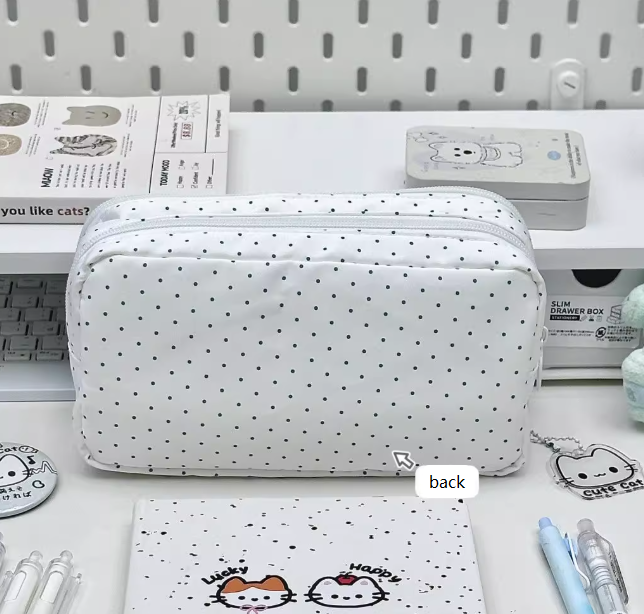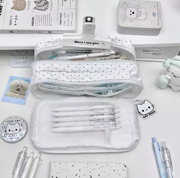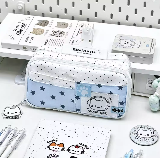 The exterior design reflects the popular INS style—clean, colorful, and effortlessly trendy. The combination of pastel blue tones with soft white polka dots and cute cat graphics gives it a dreamy, almost storybook quality. It’s the kind of pencil case that sparks compliments and brings joy every time you unzip it. The quality zippers glide smoothly, and the stitching is strong, ensuring this case lasts beyond just one school year.