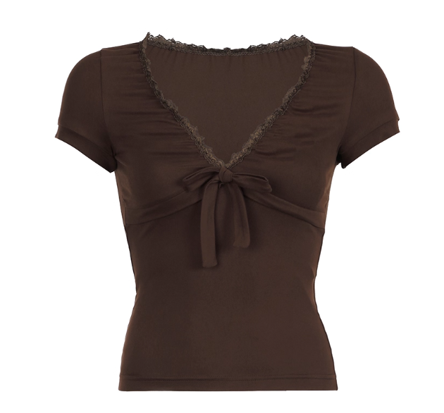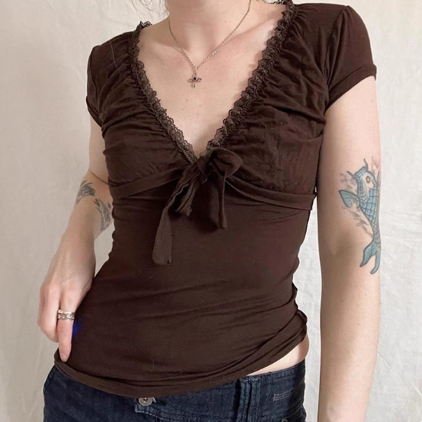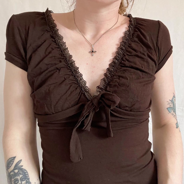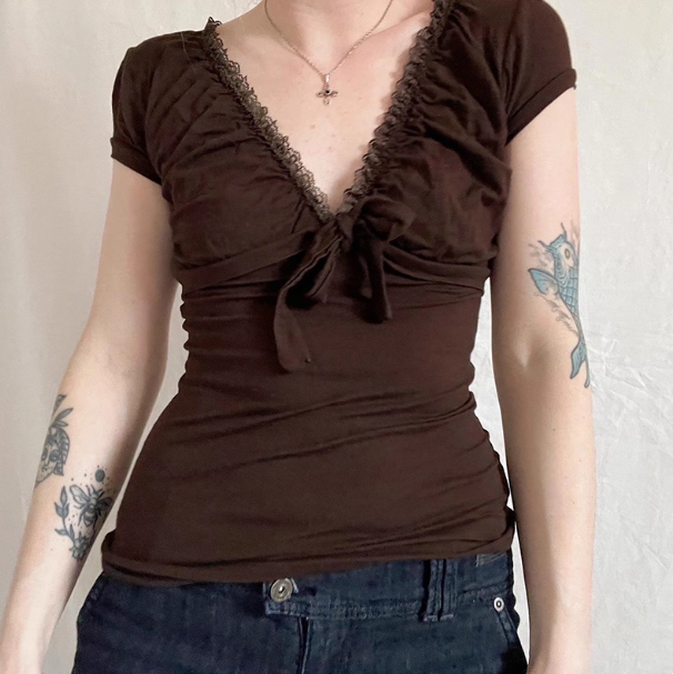 Channel timeless elegance with a retro twist in this vintage brown lace V-neck tee, designed to flatter, accentuate, and add a nostalgic charm to your summer wardrobe. With its soft ruched fabric, delicate lace trim, and fitted silhouette, this piece offers the perfect mix of retro-inspired femininity and modern versatility.