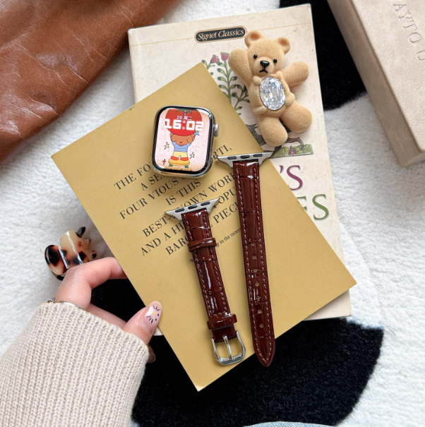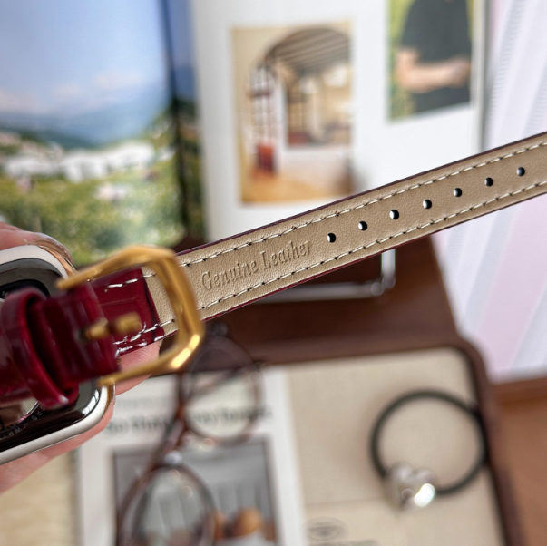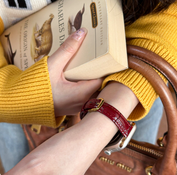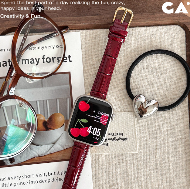 The glossy cherry finish sets this band apart from ordinary Apple Watch straps. It’s not too bold, yet it carries a playful gleam that catches the light beautifully. The tone flatters all skin tones and pairs effortlessly with Apple Watch cases in silver, gold, or rose gold. Whether matched with a chic office outfit or a soft evening dress, it completes your look with quiet sophistication.
