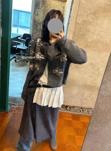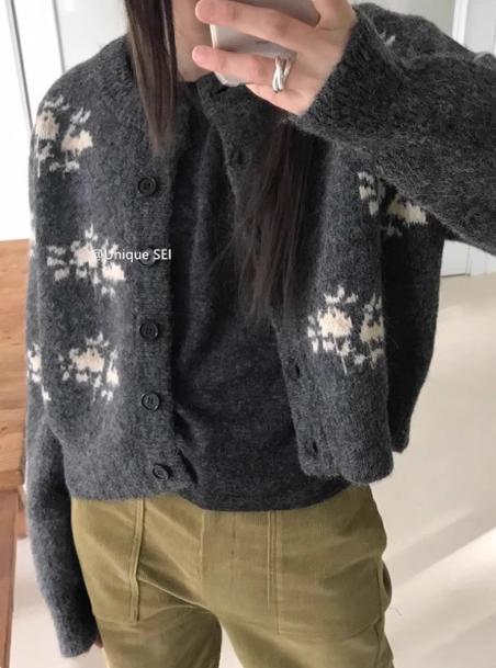 Add a touch of retro charm to your winter wardrobe with this floral knit cardigan. Designed with a short, relaxed silhouette, it combines cozy warmth with playful elegance, making it a must-have layering piece. The delicate flower pattern scattered across the knit creates a vintage-inspired look, perfect for adding personality to everyday outfits.