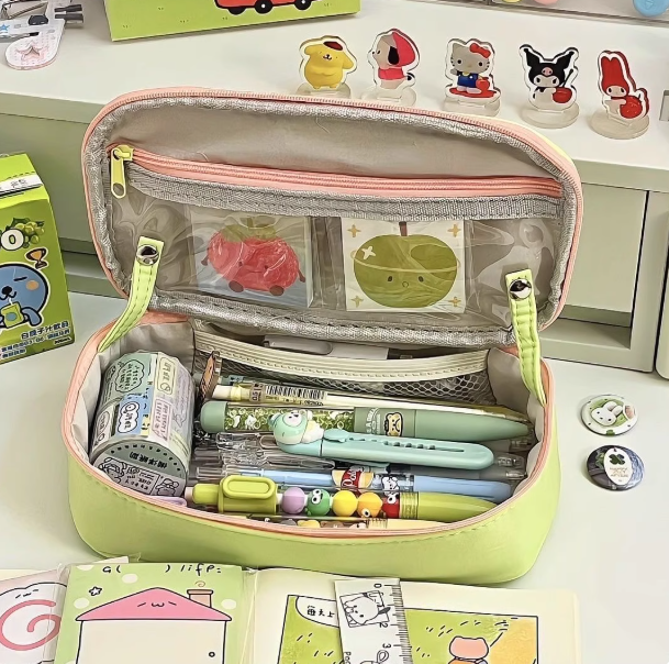 Designed for both style and convenience, this pencil case offers a large-capacity interior that easily holds pens, markers, rulers, scissors, and other daily essentials. Despite its compact appearance, the smart layout ensures every item has its place. The foldable design allows it to transform from a standing pencil holder into a portable zippered pouch, giving you flexible use for both school and home study. When folded down, it stands upright on your desk, making it easy to access your stationery while saving space.