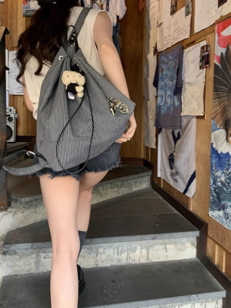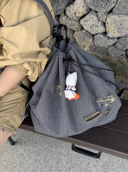 The subtle Korean-inspired design gives the bag a relaxed yet polished feel. The thin vertical stripes add a slimming, modern touch that makes it suitable for both city outings and outdoor adventures. The small decorative charm on the bag adds a playful personality without overpowering the simple elegance of the overall look.