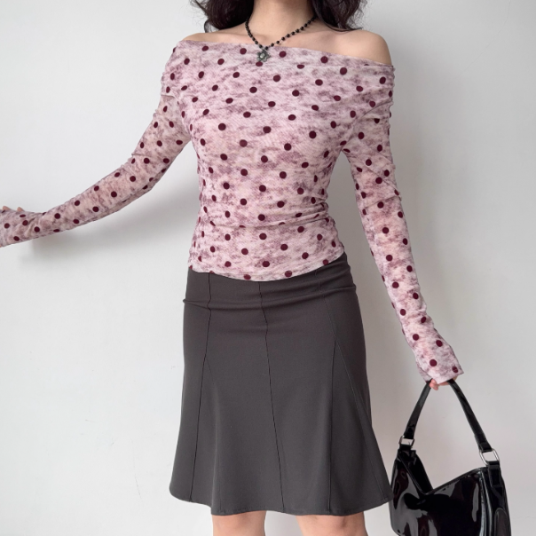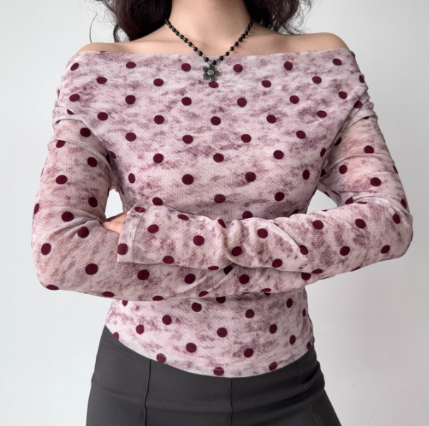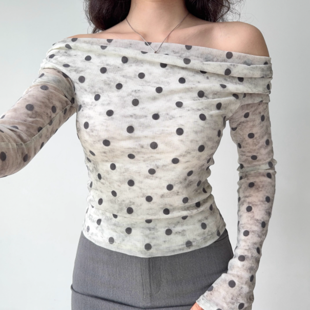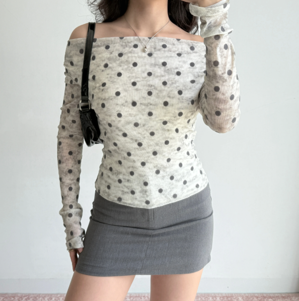 The off-shoulder cut adds a touch of allure without being overly revealing, balancing elegance and sophistication. The long sleeves elongate the arms, while the subtle polka dot pattern brings a vintage-inspired charm that’s both romantic and playful. It’s a piece that transitions seamlessly from casual daytime outings to stylish evening occasions, offering endless styling possibilities.