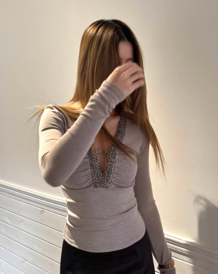 The soft V-neckline and precise tailoring help elongate the neck and highlight your collarbone, creating a graceful, feminine look. Meanwhile, the long sleeves provide coverage while maintaining a streamlined silhouette that enhances your posture. The combination of comfort and elegance makes this top a versatile essential for autumn and winter layering.
