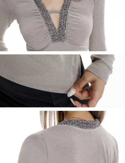 This V-neck Beaded Slim Long Sleeve Top perfectly blends sophistication with comfort, making it an essential piece for any modern woman’s wardrobe. Crafted from soft, stretchable fabric, it gently hugs your figure to create a sleek and flattering silhouette. The deep V-neckline enhances the natural curve of the neckline, offering a subtle yet elegant allure that suits both casual and dressy occasions.