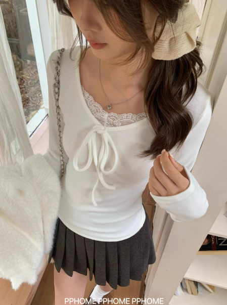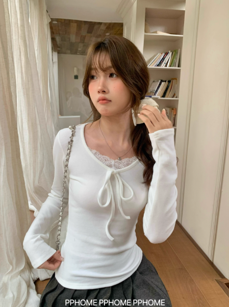 A standout feature of this piece is its intricate lace detailing and charming bow accent at the neckline. The lace trim softens the overall look, giving it a subtle romantic flair, while the bow adds a youthful, graceful touch. Whether styled under a cardigan, coat, or dress, it instantly enhances your outfit with texture and femininity. The refined design perfectly captures that “pure and elegant” style — soft, delicate, yet effortlessly confident.