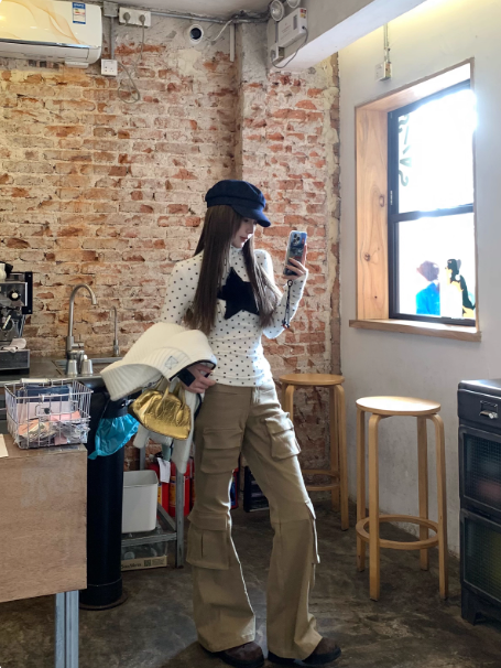 The draped “Stacked collars” neckline, also known as a slouchy or cowl turtleneck, gives this top its signature relaxed elegance. It creates soft folds that frame the neck beautifully, adding visual depth and a touch of sophistication to the simple design. Combined with the playful polka dot pattern, the look strikes a perfect balance between vintage femininity and modern chic.