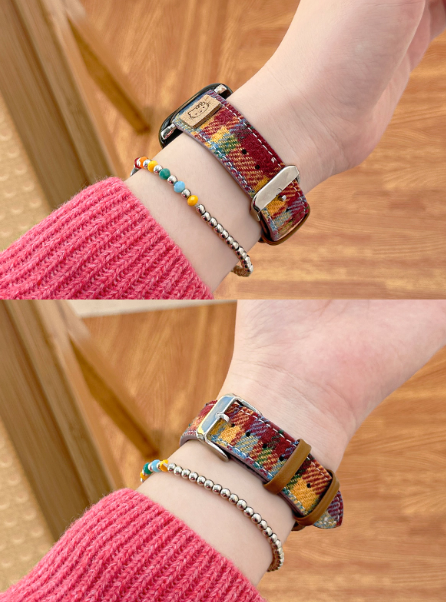 Each strap is carefully crafted to fit comfortably on the wrist, with a smooth inner lining that feels gentle against the skin. The plaid design combines multiple soft hues — blending warmth, playfulness, and vintage elegance. Whether you’re dressing up for a coffee date, a study session, or a day at work, this strap adds the perfect pop of color to your outfit.