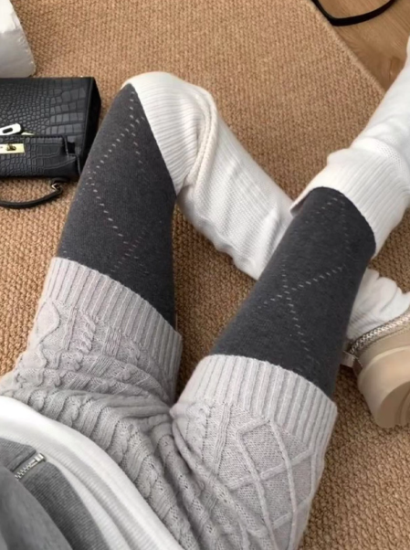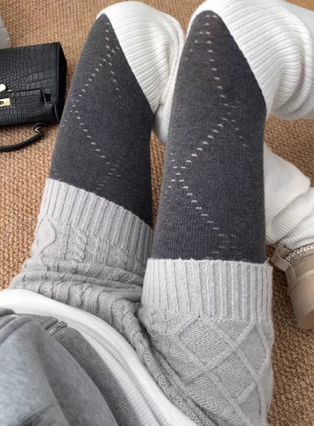 These patchwork knitted tights offer a fresh interpretation of winter legwear, bringing both warmth and a strong sense of fashion. The design combines tonal stitching and contrasting textures, which visually lengthens and slims the legs while adding complexity to the overall outfit. Instead of being just another pair of tights, they become a genuine part of the styling, contributing to the silhouette rather than just sitting underneath clothes.